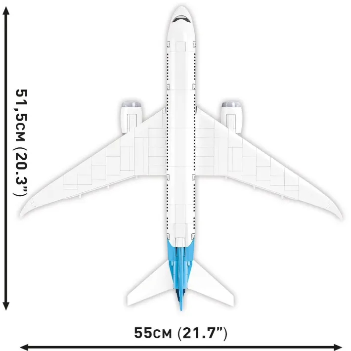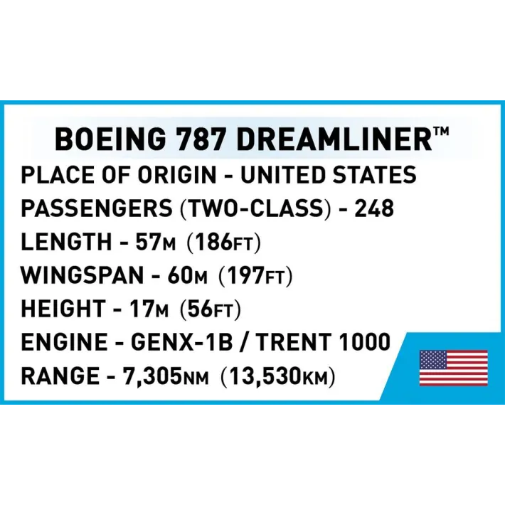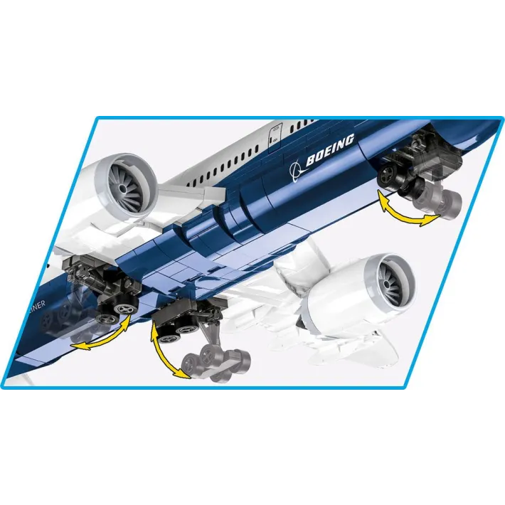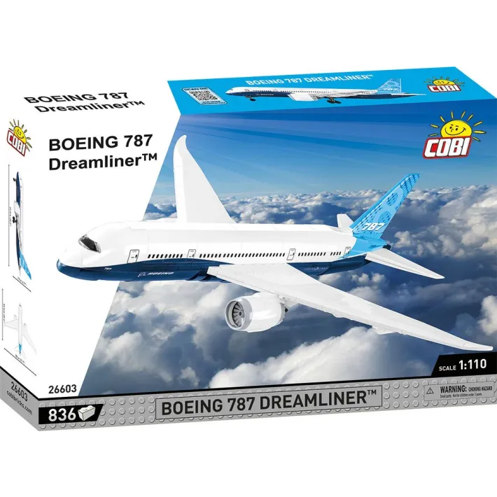 Denna byggmodell från COBI består av 836 noggrant anpassade klossar och är designad i skala 1:110 för att på ett realistiskt sätt återskapa Boeing 787-8:s karaktäristiska form. Modellen har infällbart landningsställ, roterande hjul samt motorer med roterande fläktblad monterade under vingarna. Samtliga markeringar är tryckta direkt på klossarna – inga klistermärken används.