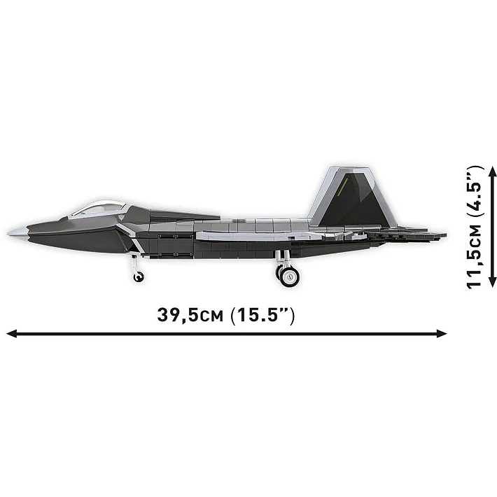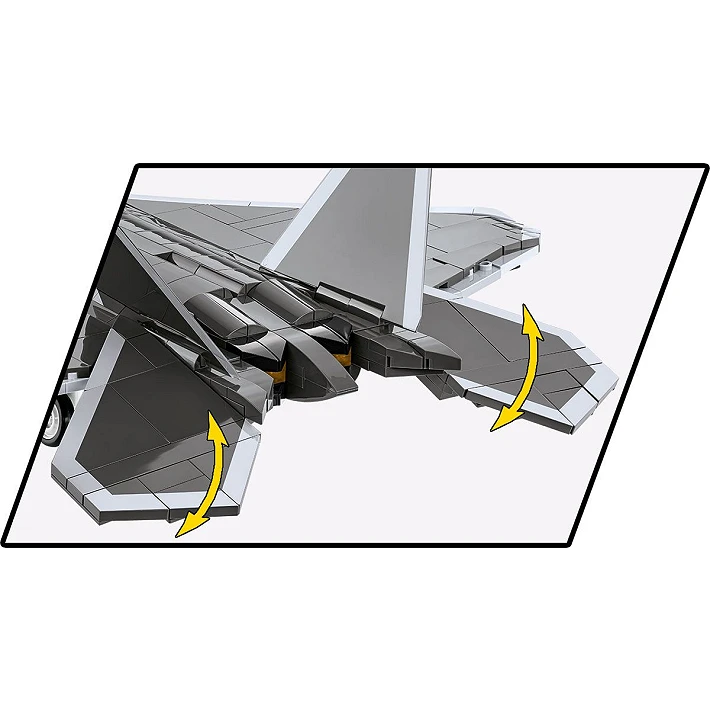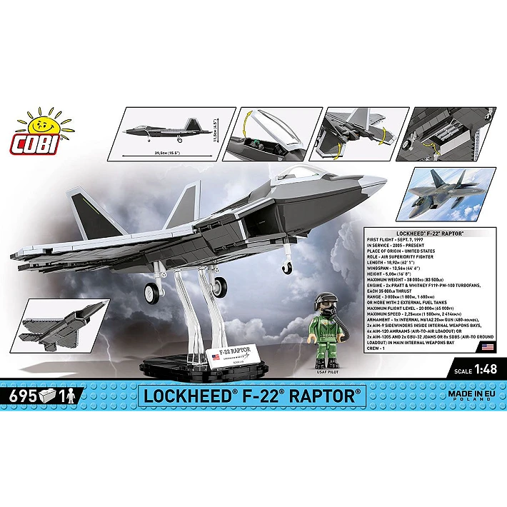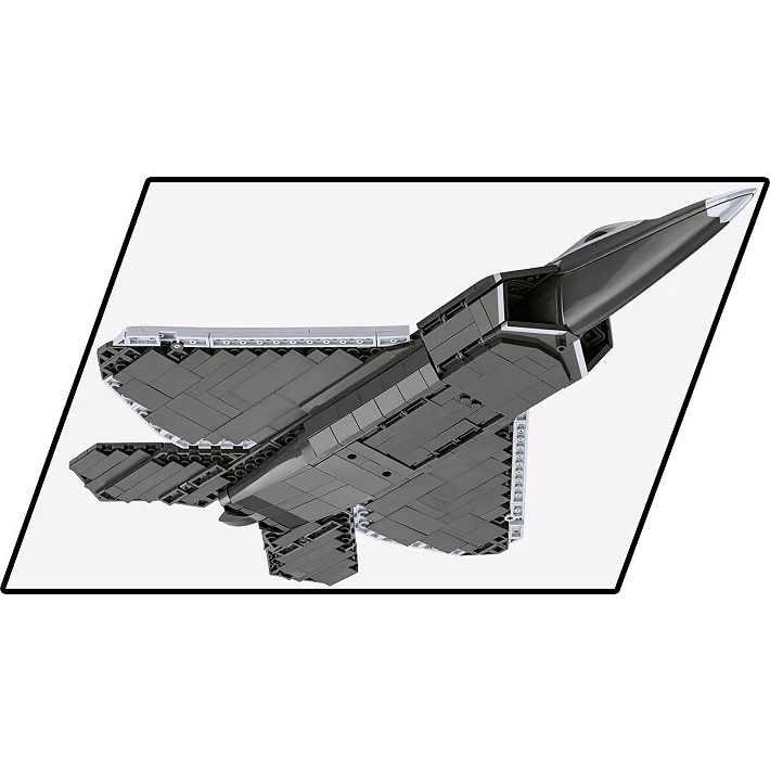 Denna byggmodell från COBI är framtagen under officiell licens från Lockheed Martin och återskapar F-22 Raptor med slät stealth-design och autentiska proportioner. Modellen har öppningsbar cockpit med pilotfigur, öppningsbart vapenutrymme samt avtagbart landningsställ för visning på det medföljande samlarstället. I stället för klistermärken används slitstarka tryck för ett exklusivt och hållbart resultat.