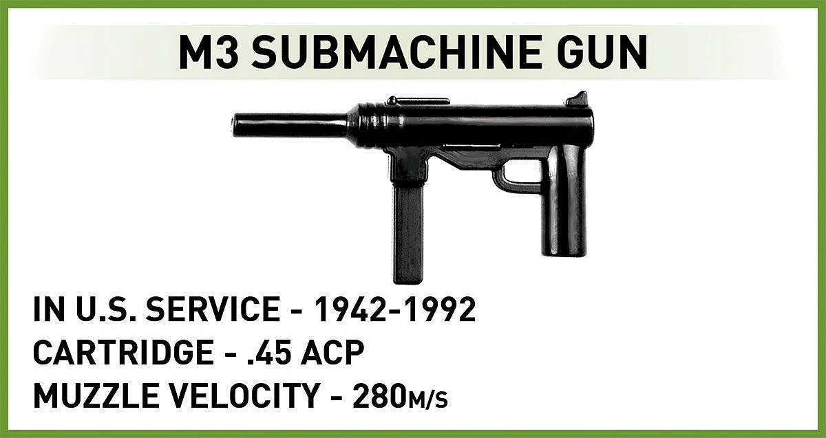 Denna byggmodell från COBI återskapar M4 Sherman med fungerande band, roterande torn och rörlig kanon. Modellen har öppningsbar lucka samt servicelucka med en detaljerad blockmotor under. Två figurer ingår: en amerikansk stridsvagnsbesättningsman med M3 “Greaser” samt en infanterist utrustad med M1 Garand. Tryckta detaljer återger fordonets märkningar och uniformernas detaljer utan användning av klistermärken. Miljödelar som staket och häck ingår för extra samlarkänsla.