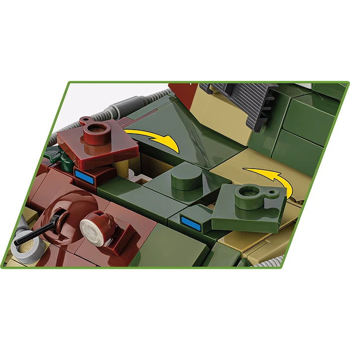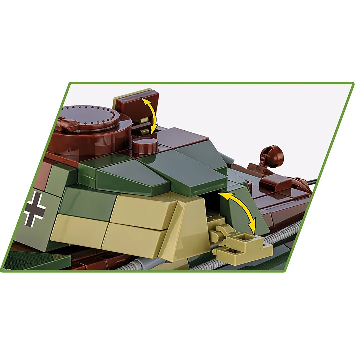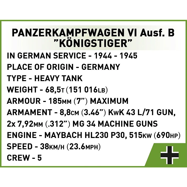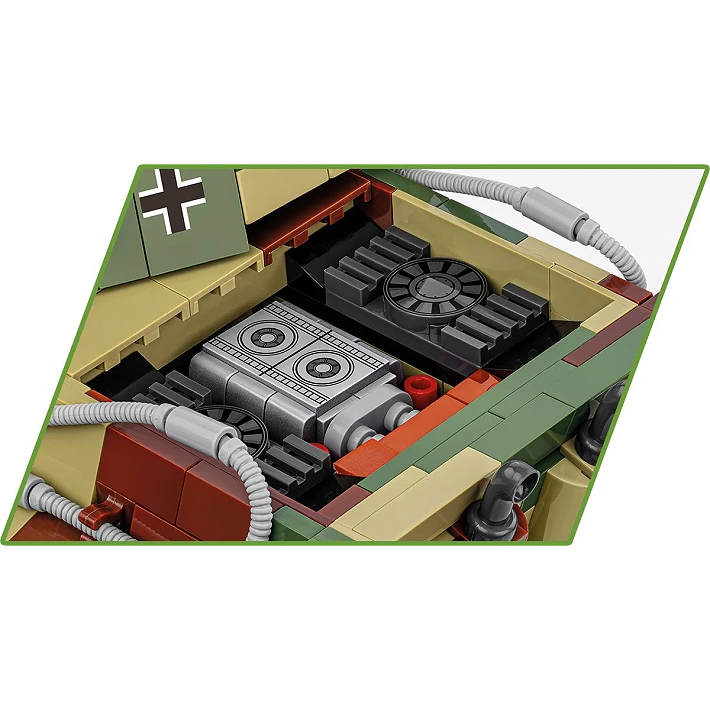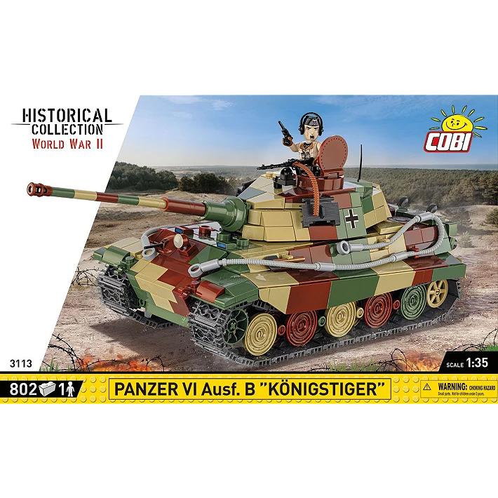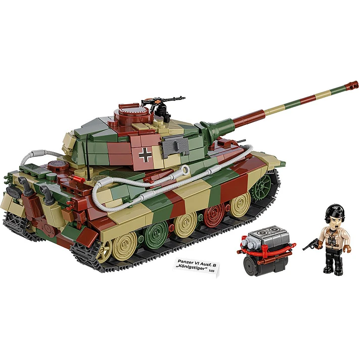 Denna byggmodell från COBI återskapar Tiger II i skala 1:35 med fungerande band, roterande torn och rörlig kanon. Modellen har öppningsbar lucka där en figur kan placeras, samt en avtagbar mini-motor som kan visas separat. Kamouflage och markeringar är tryckta direkt på klossarna för ett hållbart resultat utan klistermärken.