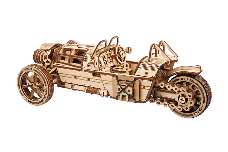 Three-Wheeler UGR-S är en sportig trehjulig modell i trä. Designen kombinerar motorcykel- och bilkänsla i ett unikt fordon. Ett kul bygge med tydlig form och närvaro.